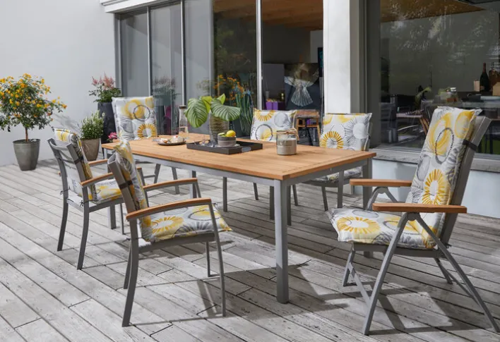 Farbe: GrauMaterial: HolzMetallOberflächenbeschichtung: pulverbeschichtetGestellart: VierfußgestellHolzart: EukalyptusholzHolzqualität: massivMetallart: Aluminium