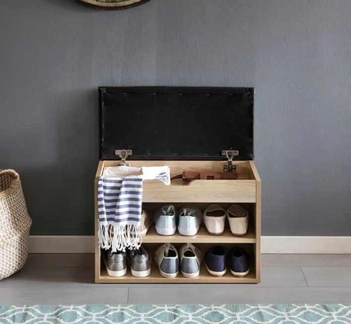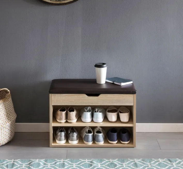 Die in den Farbtönen Grau und Braun gestaltete Garderobenbank findet mit den Maßen 60 Zentimeter Breite, 30 Zentimeter Tiefe und einer Höhe von nur 44 Zentimetern in jeder Diele einen Platz. Das offene Modell fungiert gleichzeitig als Sitzbank.