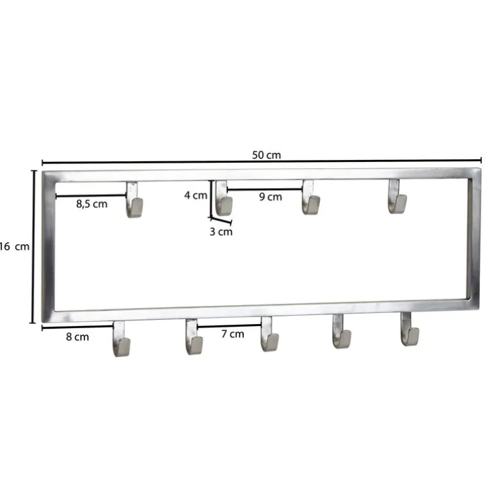 Auf der silberfarbigen Garderobenleiste mit den Maßen 50 x 20 cm lassen sich Mäntel, Jacken und Taschen aufhängen. Sie bringt insgesamt neun Haken in zwei Reihen mit und eignet sich für Singles, Paare und kleine Familien.