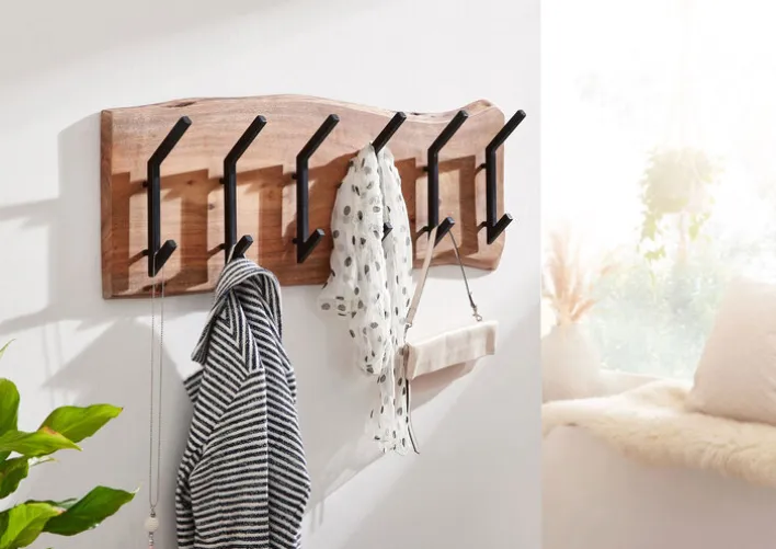 Die schön geformten Haken des Garderobenpaneels sind aus stabilem Metall gefertigt. Die Oberflächen sind lackiert. Das Paneel aus Massivholz ist glatt geschliffen und ist transparent lackiert. Die Rückseite des Garderobenpaneels ist für die Befestigung an der Wand vorbereitet.
