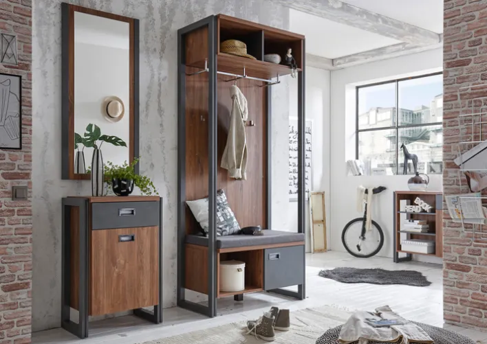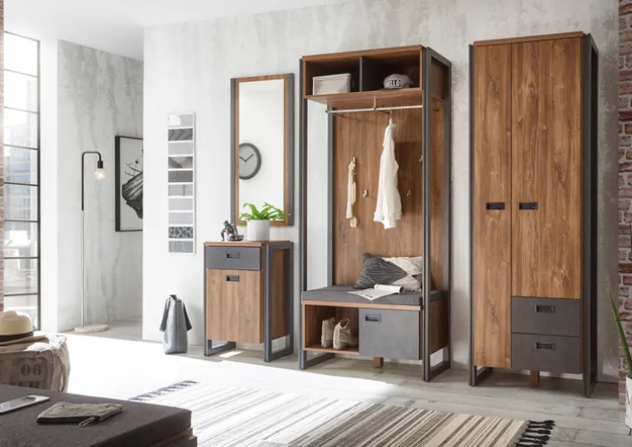 Dieses Garderobenpaneel ist das visuelle Highlight in jedem Flur, sodass der Besuch einen äußerst positiven ersten Eindruck von der Wohnung bekommt. Dies liegt unter anderem daran, dass seine Front aus einer Stirling-Oak-Holznachbildung besteht und die Applikationen in Matera-Anthrazit gehalten sind. Das Paneel hat eine Tiefe von 14 cm und besitzt nicht nur vier Garderobenhaken sondern ebenso eine praktische Ablage. Darüber hinaus ist es mit einem Spiegel zum schnellen Zurechtmachen ausgestattet.