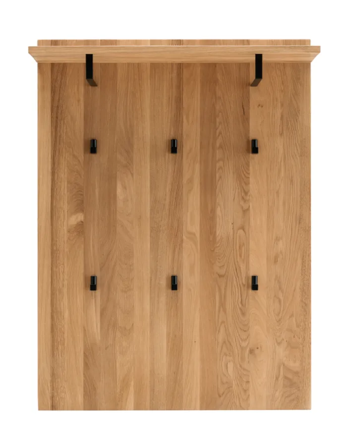 Das Garderobenpaneel LIDO vereint Funktionalität und ansprechendes Design im Landhausstil. Gefertigt aus massivem Eichenholz, bietet es eine geölte Oberfläche, die die natürliche Holzmaserung betont. Mit einer Breite von 80 cm, einer Höhe von 91 cm und einer Tiefe von 30 cm passt es ideal in verschiedene Wohnräume. Die Hauptfarbe Braun harmoniert perfekt mit den schwarzen Metallakzenten der Haken und Kleiderstangen.