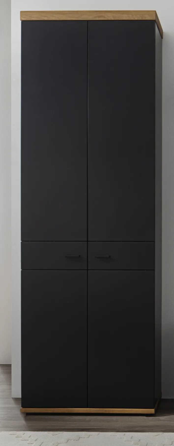Der Garderobenschrank aus der Serie BOGOTA vereint modernes Design mit praktischer Funktionalität. Mit einer Breite von 70 cm, einer Höhe von 211 cm und einer Tiefe von 37 cm bietet er ausreichend Stauraum für Kleidung und Accessoires. Der Schrank ist in einem eleganten Anthrazit gehalten, das durch die Wildeiche-Akzente an der Ober- und Unterseite stilvoll ergänzt wird. Diese Kombination aus Farben und Materialien verleiht dem Schrank ein zeitgemäßes und dennoch warmes Erscheinungsbild.