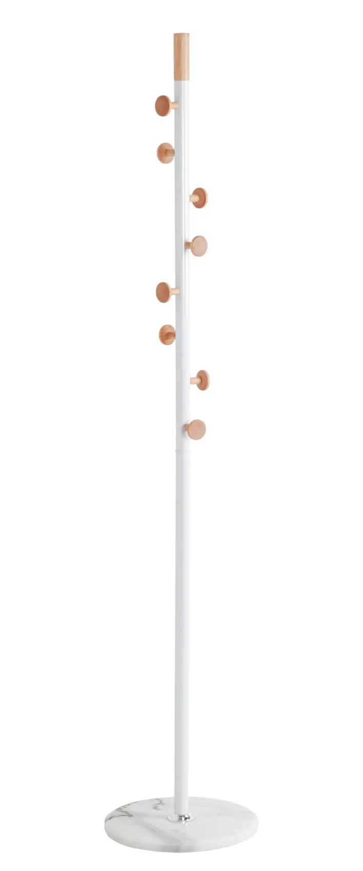 Dieser Garderobenständer mit einer Größe von 35 x 178 cm zeichnet sich durch verschiedene Farbtöne aus: Natur/Marmor, Braun und Weiß. An acht Haken finden Jacken, Taschen und mehr einen Platz.