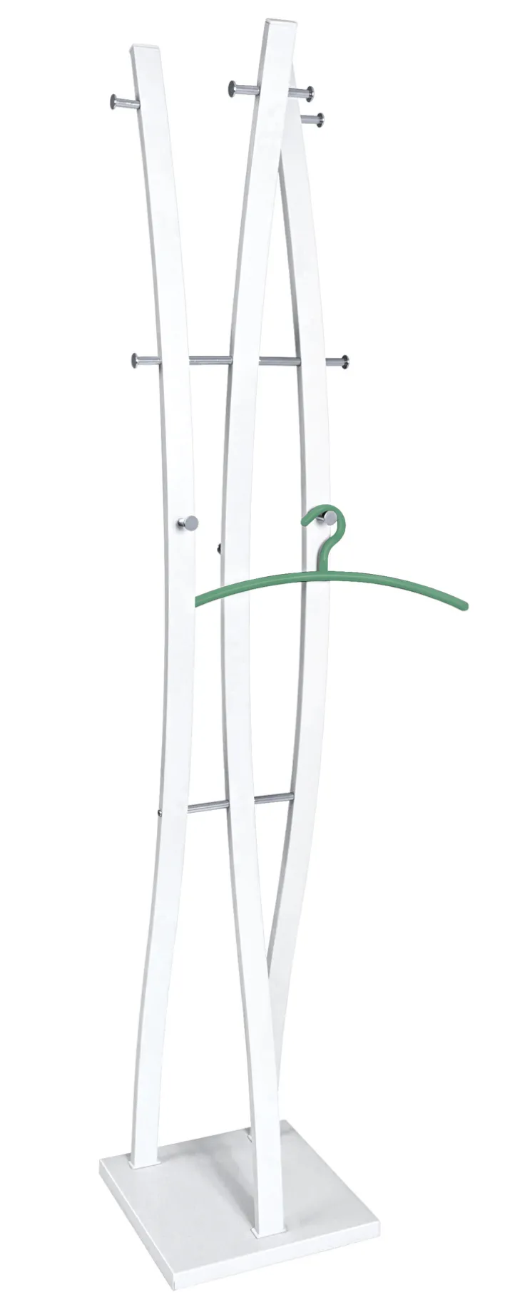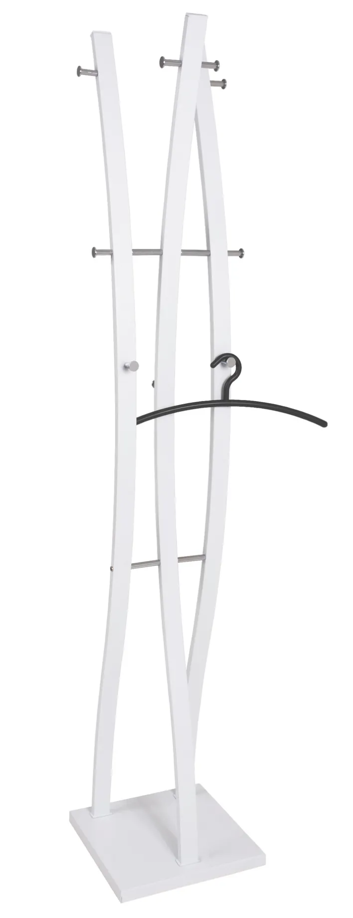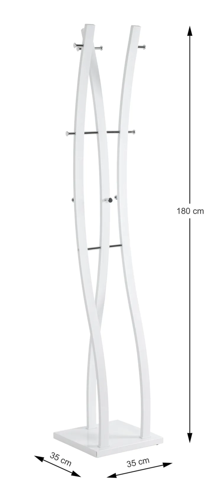 Der anmutige Garderobenständer BENNO ist 35 x 180 x 35 cm groß und aus weißem Chrom gefertigt.