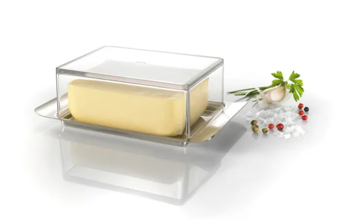 Die GEFU Butterdose BUTELO verbindet praktische Funktionalität mit modernem Design. Die Butter liegt auf einem silberfarbige Teller, ein transparenter Deckel schließt die rechteckige Dose sicher ab.