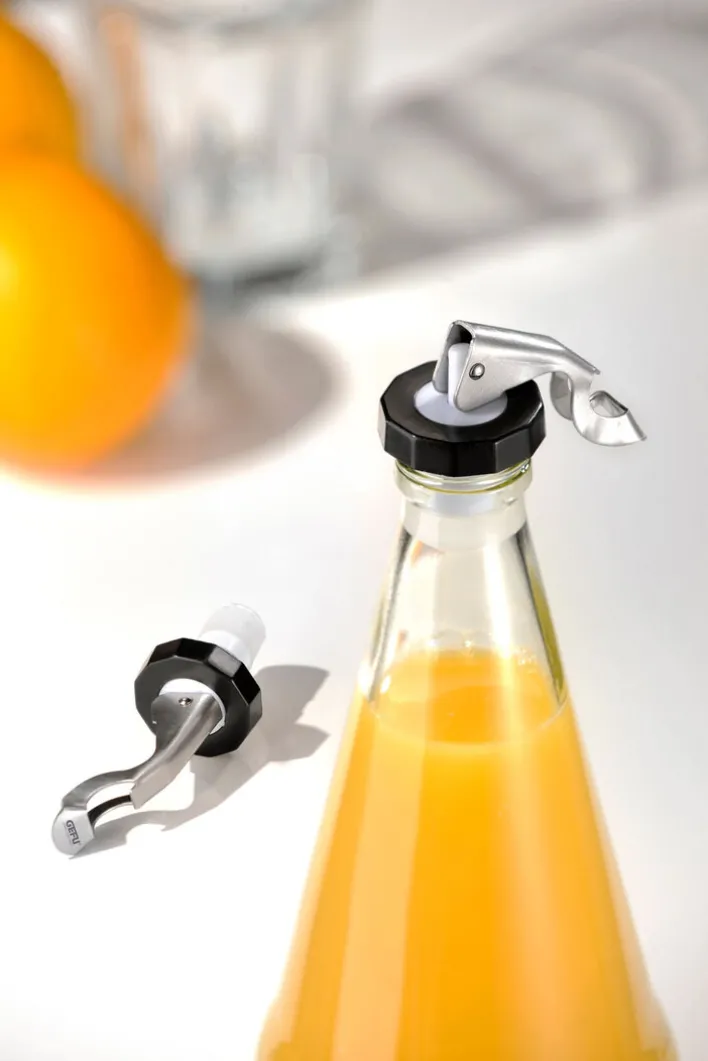 Der GEFU Flaschenverschluss wird im 2er Set geliefert. Er ist mit einem integrierten Flaschenöffner im Hebel ausgestattet. Beide Verschlüsse sind für die Spülmaschine geeignet.