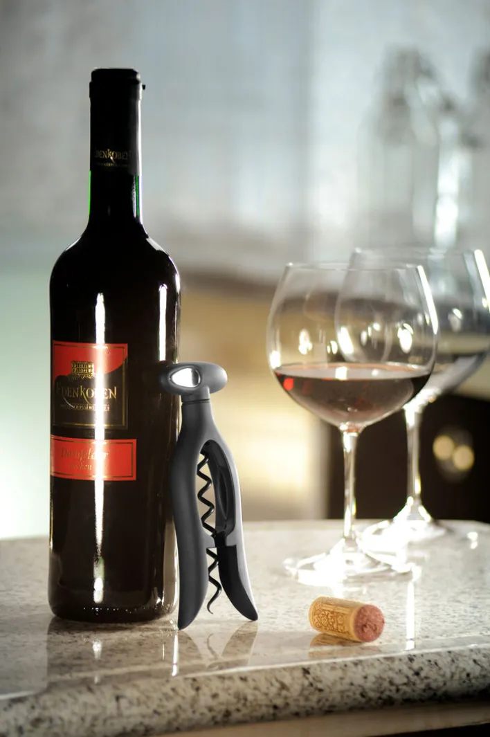 Die mit Santopren beschichtete Spindel des Korkenziehers besteht aus Metall. Die Hebel und die Mechanik sind aus stabilem Kunststoff gefertigt. Die griffigen Oberflächen sind besonders pflegeleicht. Mit den Maßen 14,5 x 6,5 x 2,0 cm passt der Korkenzieher in jede Küchenschublade.