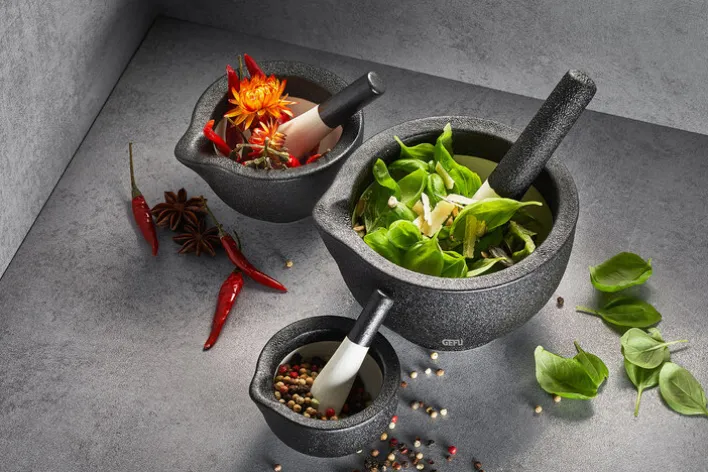 Der handgearbeitete GEFU Mörser GRINO in edler Gussoptik ist durch seine Oberflächenbeschichtung besonders handlich. Er verfügt über eine praktische Ausgießnase. Das Mahlergebnis wird durch die aufgeraute Oberfläche im Inneren perfekt. So lassen sich verschiedene Kräuter und Gewürze zerkleinern oder zu Pulver zermahlen, die zum Würzen, für eigene Gewürzmischungen oder zum Zubereiten von frischen Pestos, anderen Würzsoßen und Dips genutzt werden können. Nach der Verwendung kann der Mörser aus Porzellan in die Spülmaschine.