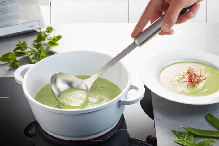 Er eignet sich zur Aufnahme von kalten und warmen Flüssigkeiten jeglicher Art und ist ein praktisches Utensil zum komfortablen Abfüllen von Suppen. Dank dem ergonomisch geformten Griff kann dies ohne zu tropfen realisiert werden. Die Hochwertigkeit des Schöpflöffels wird insbesondere durch die Materialien Edelstahl und Kunststoff unterstrichen. Das Metall rostet nicht und der Schöpflöffel eignet sich zur Spülmaschinenreinigung.