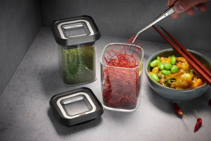 Des Weiteren kann die Vorratsdose für Gewürze und Kräuter zum Einsatz kommen. Drei Haftetiketten zum Beschriften werden mitgeliefert. Die Box ist platzsparend stapelbar und luftdicht. Reinigen lässt sie sich ganz bequem in der Spülmaschine.