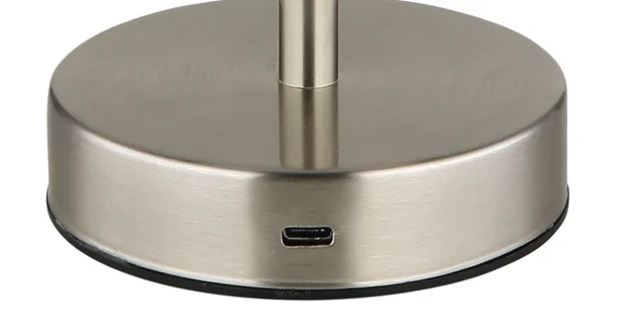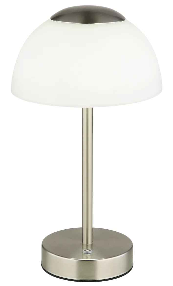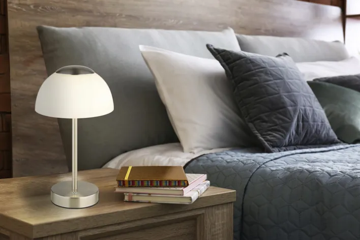 Die nickelfarbige Akku-Tischleuchte SAMIRA mit einer Höhe von 31 cm ist ein Allround-Talent: Die Farbtemperatur lässt sich in einer Bandbreite von 2.700 bis 6.500 K verändern. Die Kombination aus Glasschirm und Metallgestell überzeugt ebenfalls.