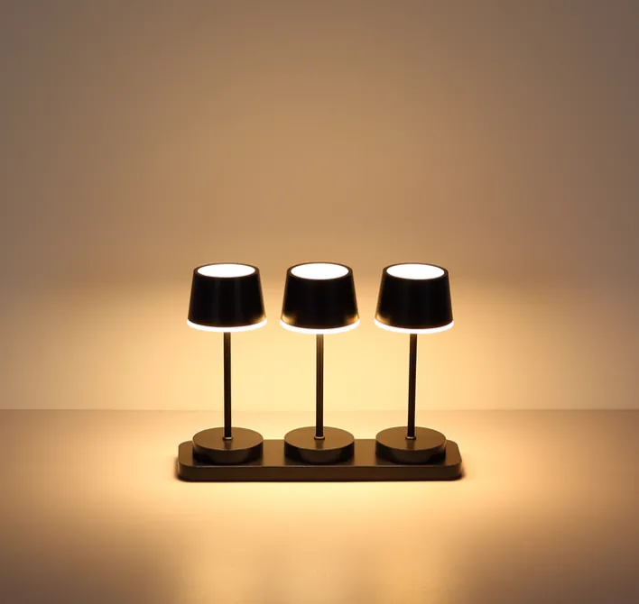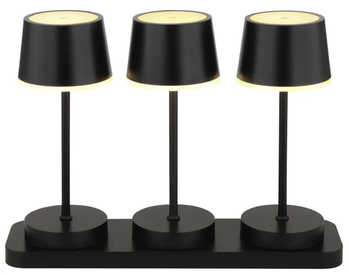 Die Akku LED Tischleuchte DAWSON von GLOBO vereint modernes Design mit praktischer Funktionalität. Dieses Set besteht aus drei stilvollen Tischlampen, die auf einer eleganten Ladestation platziert sind. Die Lampen sind in einem zeitlosen Schwarz gehalten und bestehen aus einer Kombination von Kunststoff und Metall, was ihnen eine robuste und dennoch ansprechende Optik verleiht. Die konische, runde Form der Lampenschirme ergänzt den skandinavischen Stil, der sich nahtlos in verschiedene Wohnumgebungen einfügt.