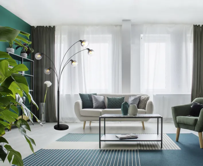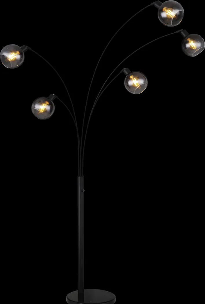 Die Bogenlampe SEYMOUR von Globo vereint modernes Design mit funktionaler Beleuchtung. Mit einer Höhe von 208 cm und einer Breite von 110 cm bietet sie eine beeindruckende Präsenz in jedem Raum. Die Lampe verfügt über fünf Brennstellen, die mit E27-Fassungen ausgestattet sind, und unterstützt sowohl AGL- als auch Retrofit-Leuchtmittel, die jedoch nicht im Lieferumfang enthalten sind. Der Energieverbrauch beträgt maximal 200 W, was eine effiziente Beleuchtung gewährleistet. Das Design der Lampe zeichnet sich durch ihre runden, rauchfarbenen Glaskugeln aus, die auf eleganten, schwarzen Metallarmen montiert sind. Diese Kombination verleiht der Lampe einen industriellen und skandinavischen Stil, der sich nahtlos in verschiedene Einrichtungsstile einfügt. Der stabile Tellerfuß aus schwarzem Marmor sorgt für sicheren Stand und unterstreicht die hochwertige Verarbeitung. Die Schutzklasse 2 und die Schutzart IP20 bieten zusätzlichen Schutz und Sicherheit. Ein Ein-/Ausschalter ist integriert, um die Bedienung zu erleichtern.