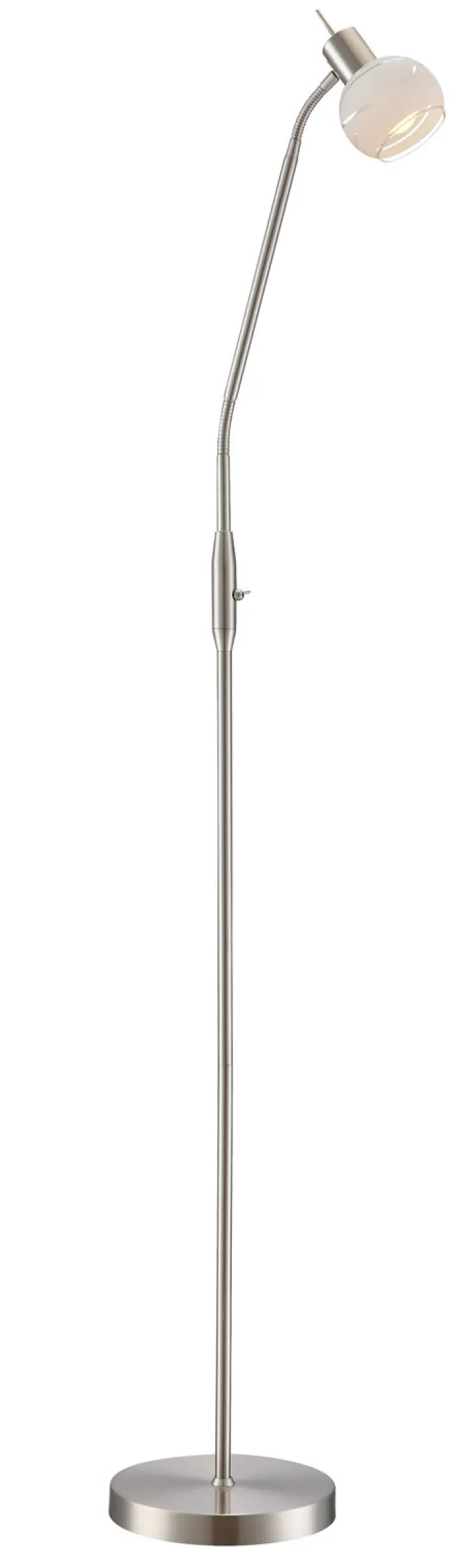 Bodenplatte und Gestell sind bei der Stehlampe ELLIOT von GLOBO aus Metall silberfarbig ausgeführt. Der obere Teil des Lampengestells ist mit einem Ein/Ausschalter versehen und mehrfach verstellbar. Sie können den Tragarm neigen und den kugelförmigen Lampenschirm aus Glas in Weiß drehen. Das LED Leuchtmittel verbraucht 5 Watt und brennt, unabhängigen Tests zufolge etwa 10.000 Stunden. Die Helligkeit beträgt 320 Lumen, die Farbtemperatur 3.000 Kelvin. Wenn Sie sich für ein weniger energieeffizientes Leuchtmittel entscheiden, steigt der maximale Energieverbrauch der Stehleuchte ELLIOTT auf 40 Watt. Das Produkt von GLOBO ist für den inneren Wohnbereich konzipiert, CE zertifiziert und entspricht der Schutzart IP 20 sowie der Schutzklasse 2.