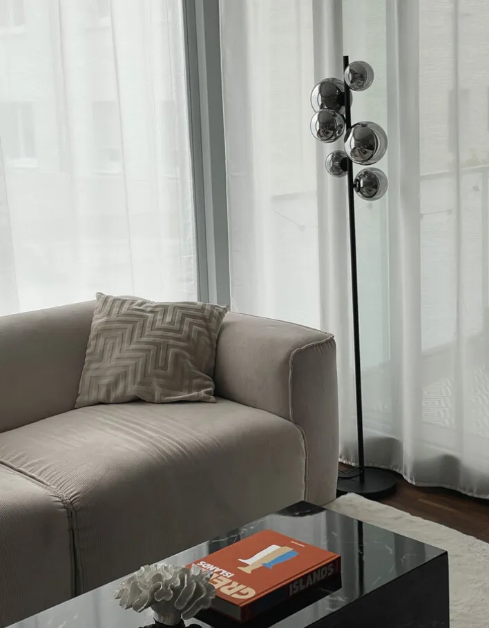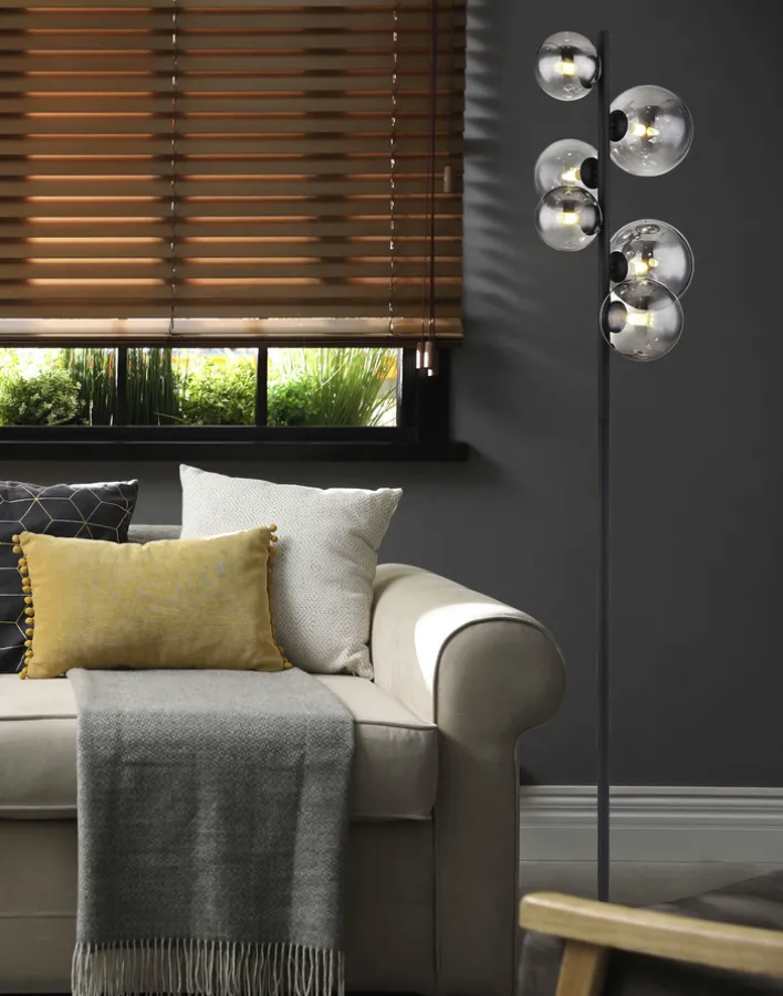 Die LED Retrofit Stehlampe RIHA fügt sich gut in modere Wohnräume ein. Es lässt sich ein Lichtakzent setzen. Die Lampenschirme sind asymmetrisch und in unterschiedlichen Höhen an der schwarzen Stange aus Metall angebracht. Die Stehleuchte von GLOBO kann über einen Trittschalter an- und ausgeschalten werden. Sie verfügt über 6 LED, die ein warmweißes Licht spenden. Der maximale Energieverbrauch liegt bei 21 Watt. Die Leuchtmittel mit G9 Sockel sind wechselbar.