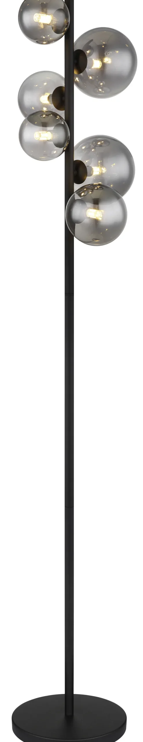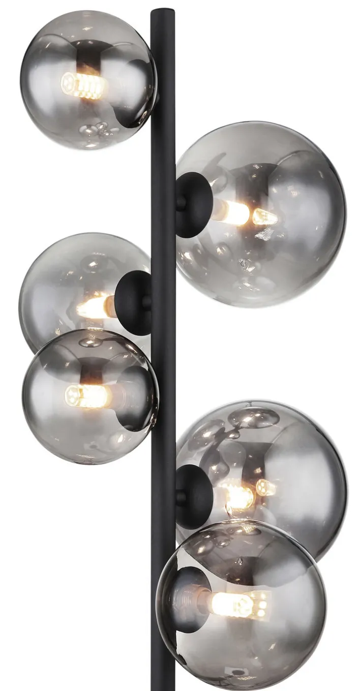 Die LED Retrofit Stehlampe RIHA von GLOBO hat ein dekoratives Design. Schirme aus rauchig grauem Glas befinden sich im oberen Bereich einer schwarzen Metallstange. Die Stehleuchte hat eine Höhe von 155 cm.