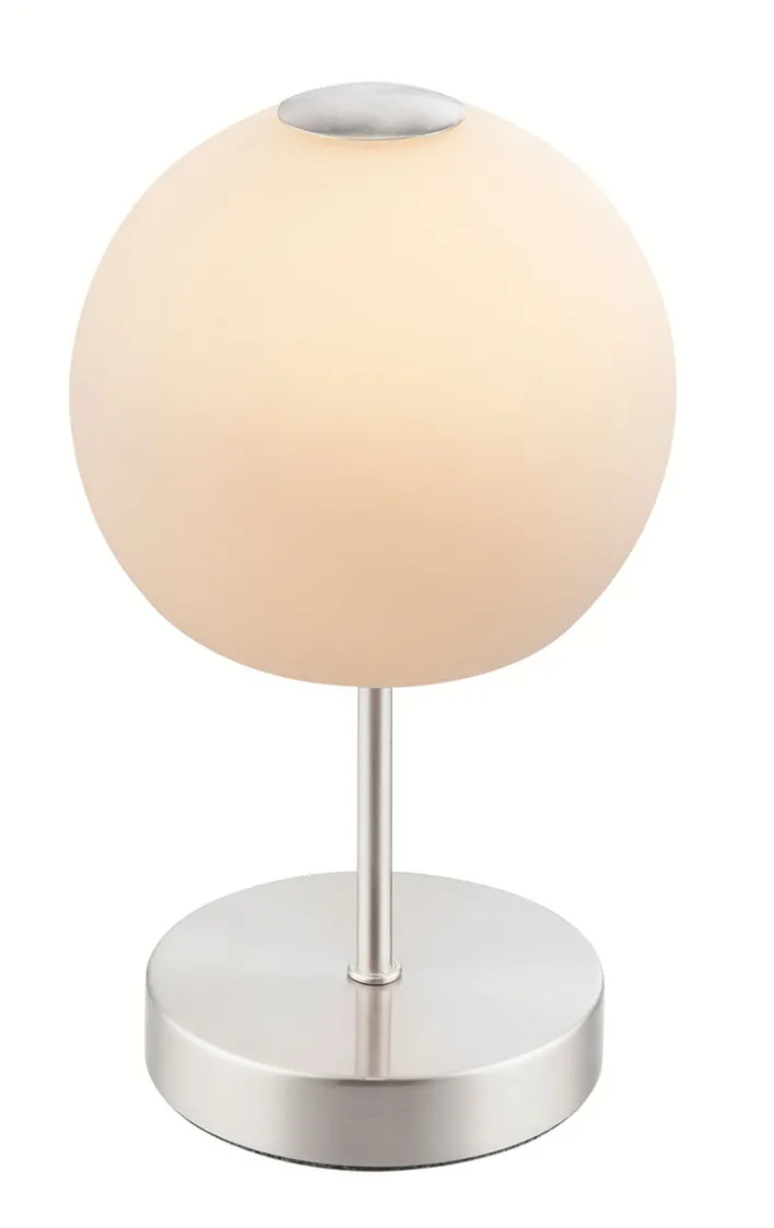 Der kugelförmige Lampenschirm der Tischlampe ist aus hochwertig verarbeitetem Glas hergestellt. Das weiße Glas ist satiniert. Der Lampenfuß ist aus Metall gefertigt und sorgt für einen sicheren Stand. Das LED-Leuchtmittel ist fest in das Gehäuse der Tischlampe eingebaut.