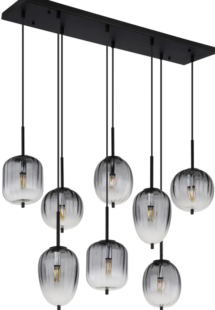 Das Balkenpendel ATTILA von Globo vereint stilvolles Design mit funktionaler Beleuchtung. Mit einer Breite von 102,5 cm und einer Höhe von 120 cm fügt sie sich harmonisch in verschiedene Raumkonzepte ein. Die Leuchte besteht aus hochwertigem Metall und Rauchglas, was ihr eine elegante Optik verleiht. Die acht Brennstellen sind für E14-Leuchtmittel geeignet, die nicht im Lieferumfang enthalten sind, und leicht ausgetauscht werden können. Die Hauptfarbe schwarz kombiniert mit rauchfarbenem Glas sorgt für ein modernes Ambiente. Die Leuchte ist in der Schutzklasse 1 und mit der Schutzart IP20 ausgestattet, was sie ideal für den Innenbereich macht. Der Energieverbrauch beträgt maximal 320 W. Diese Pendelleuchte ist perfekt für den Einsatz über Esstischen oder in Wohnbereichen geeignet und bietet eine gleichmäßige Ausleuchtung. Die bauchige Form der Glaskörper verleiht der Leuchte eine besondere Note.