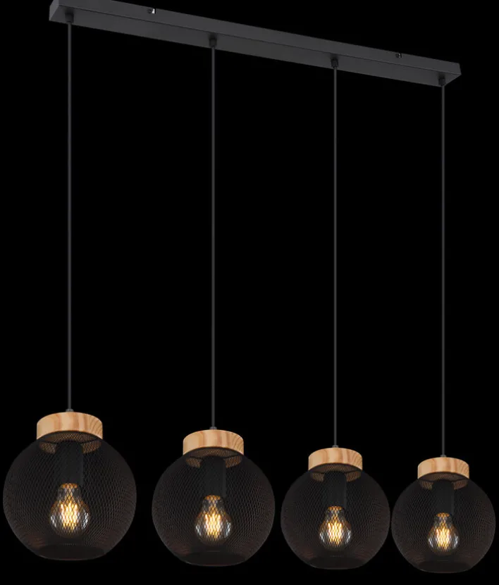 Die vier Kugeln der Lampe werfen mit dem aparten Gittermuster einen feinen Lichtschein in jeden Raum. Die Pendelleuchte mit den Fassungen aus braunem Holz und der schwarzen Deckenleiste hängt mit einem geringen Gewicht von nur 2,48 Kilogramm sicher an jeder Decke. Die Gitterkugeln sind aus langlebigem Metall gearbeitet. Die vier Leuchtmittel bieten mit jeweils 40 Watt zusammen insbesondere über Tischen eine angenehme Helligkeit von 160 Watt.