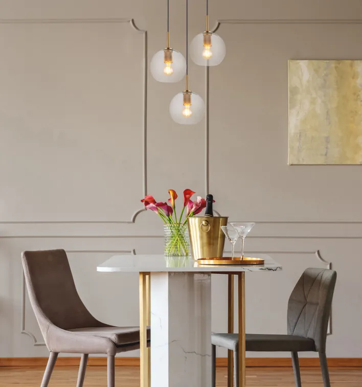 Die GLOBO Retrofit Pendelleuchte ADARA ist 120 cm lang, sie hat einen Gesamtdurchmesser von 47 cm. Sie ist aus messingfarbenem Metall, 3-flammig, der einzelne Lampenschirm aus klarem Glas hat einen Durchmesser von 20 cm.