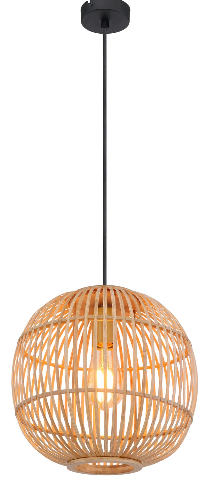 Die GLOBO Retrofit Pendelleuchte HILDEGARD hat einen Durchmesser von 30 cm, sie ist 150 cm hoch. Der Durchmesser des Deckenschilds miss 9 cm. Ihr Lampenschirm ist aus Bambus.