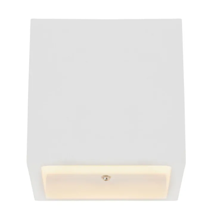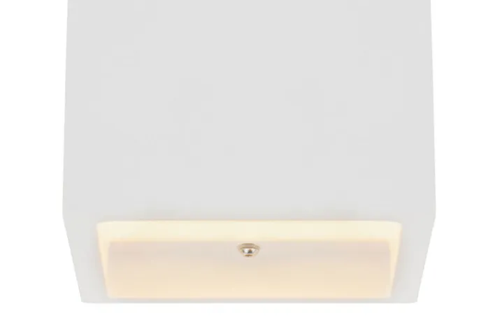 Das Up & Down Licht strahlt aus der würfelförmigen, weißen Wandleuchte CHRISTINE von GLOBO, die aus Gips gestaltet und optisch absolut unauffällig ist. Die Kanten des kleinen Würfels sind jeweils 11,5 Zentimeter lang.