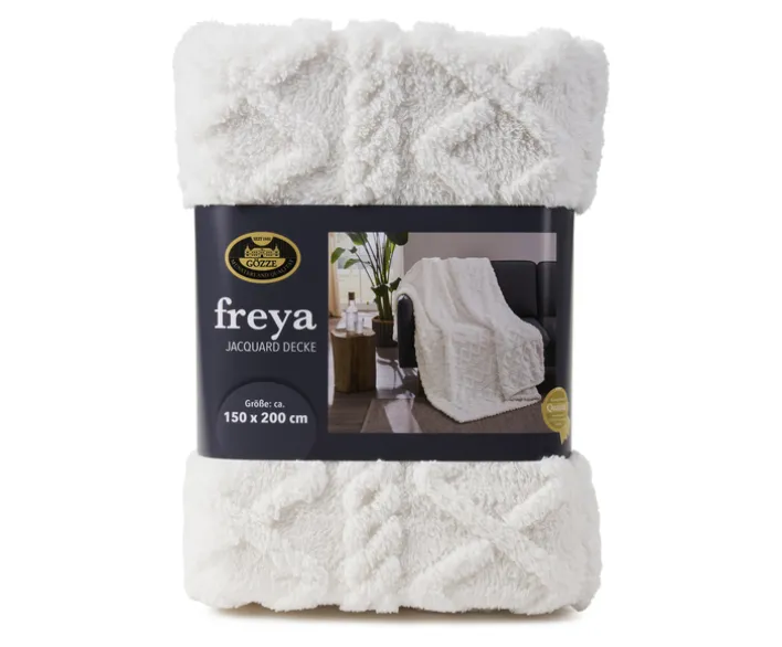 Die FREYA Wohndecke aus dem Hause GÖZZE fühlt sich auf dem Sofa und auf Wohnlandschaften wohl, ebenso aber beispielsweise im Schlafzimmer. Vielseitig einsetzbar, ist der Stoff der Decke, der sich aus Polyesterfasern zusammensetzt, zudem noch sehr robust – bei Bedarf wird die Decke einfach bei bis zu 30 Grad in die Maschine gegeben.
