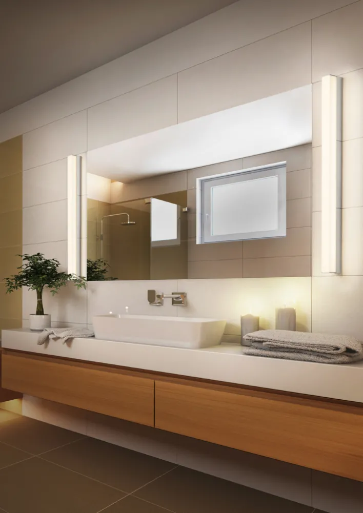 Die Badlampe LADO kann als Paar vertikal auf jeder Seite des Spiegels oder als einzelne Leuchte horizontal über dem Spiegel angebracht werden. Die Spiegelleuchte aus dem Hause helestra sorgt im Badezimmer oder Gäste-WC für eine angenehme Beleuchtung mit warmweißem Licht. Im Lieferumfang ist das Zubehör zur Montage an der Wand oder am Spiegel enthalten.