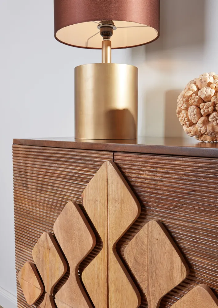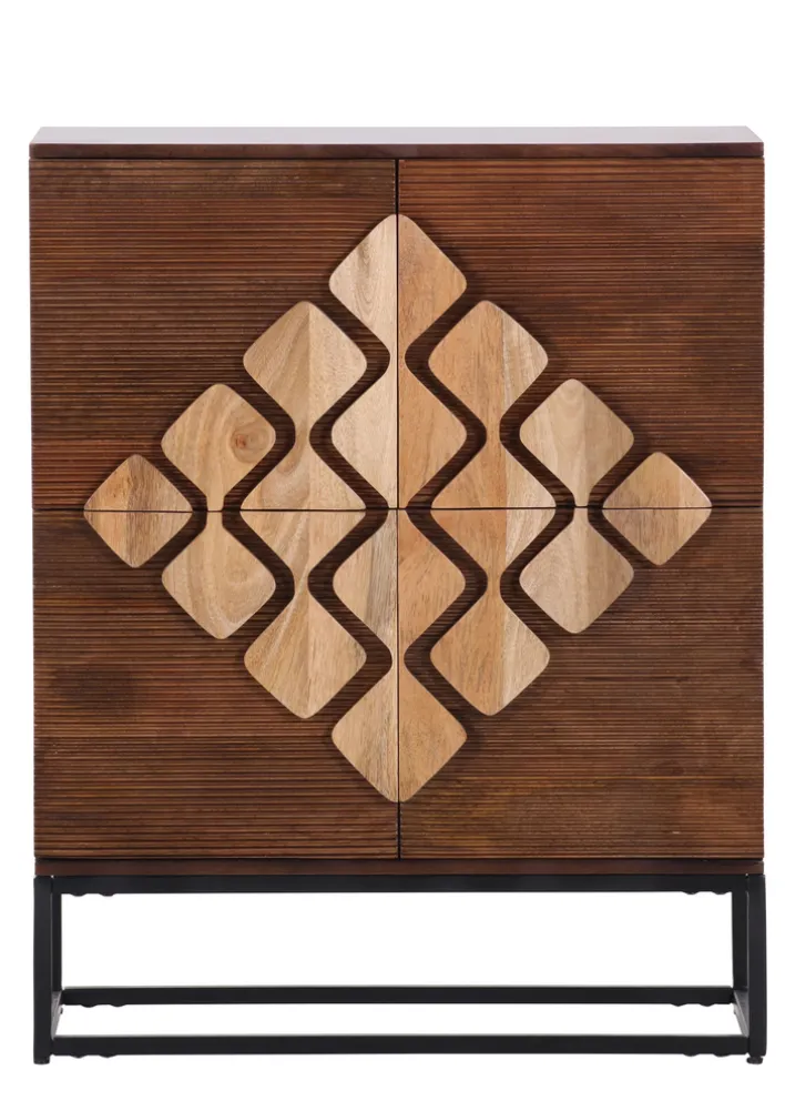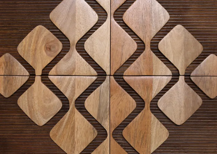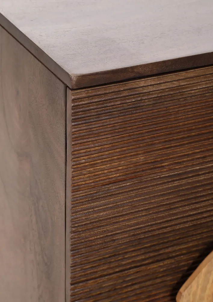 Gefertigt aus massivem Mangoholz, präsentiert sich die Oberfläche braun gebeizt und lackiert. Die Frontabsetzung zeigt naturfarbenes Mangoholz mit geometrisch angeordnetem Reliefmuster, das einen auffälligen Kontrast und eine besondere Struktur bietet.
