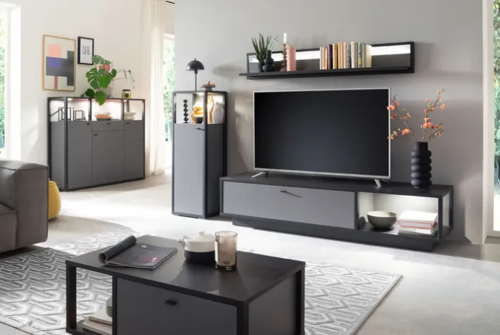 Dieses Highboard aus MDF-Spanplatte und Melaminharz hat eine Tiefe von 37 cm und ist dank seiner Form und grau-schwarzen Farbgebung ein optisches Highlight im Wohnzimmer. Dank fünf Einlegeböden, einem Schubkasten sowie drei offenen Fächern dient dieses Möbel auch als Stauraum und unterstützt somit die Ordnung im Zimmer. Darüber hinaus verfügt es über drei Drehtüren, sodass die dahinterliegenden Dinge vor Staub geschützt sind. Das Lowboard kann hervorragend mit anderen Möbelstücken der gleichen Serie kombiniert werden.
