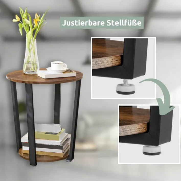 Der runde holz4home Beistelltisch mit den Abmessungen 50 x 57 cm präsentiert sich im angesagten Industrie-Stil und passt in moderne Einrichtungen. Durch das elegante Holzdekor der Ablageböden in Vintagebraun und das schwarzfarbige Gestell fällt der Beisteller sofort ins Auge. Der Tisch eignet sich für Wohn- oder Esszimmer und ist auch für eine gemütliche Sitzecke die passende Ergänzung. Die Ablagen bieten viel Platz für verschiedene Accessoires. Der Beistelltisch hat Charme und sorgt für eine wohnliche Atmosphäre.