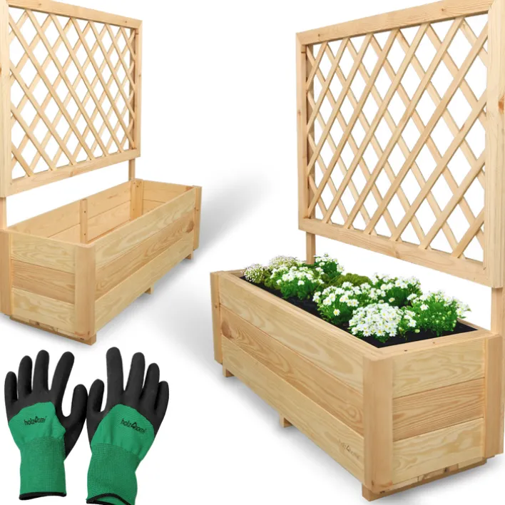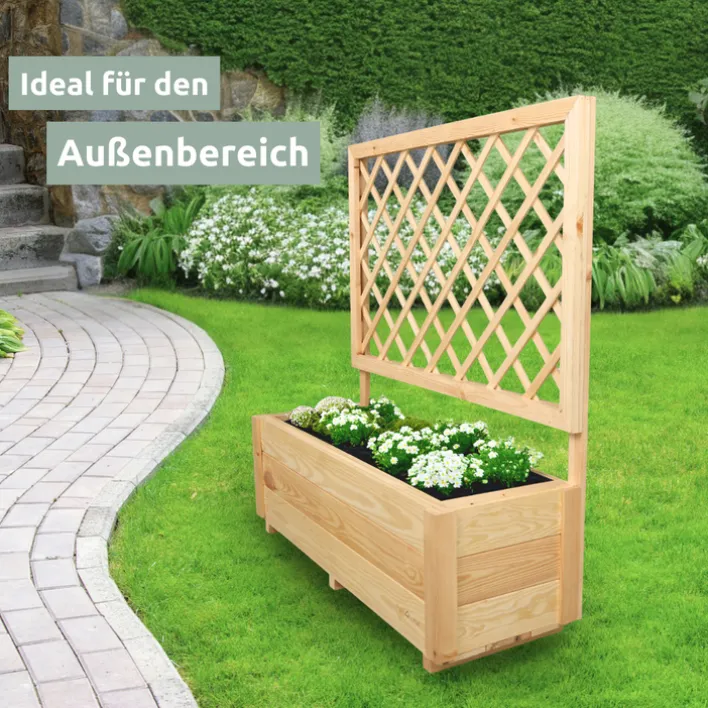 Hier hat richtig was Platz. Die Breite des holz4home Pflanzkasten ist perfekt für Balkon, Terrasse und überall da, wo ein Spalier oder leichter Sichtschutz gewünscht wird. Am durchbrochenen Gitter ranken sich im Sommer die schönsten Blumen, im Schatten gedeiht Efeu besonders gut. In der kalten Jahreszeit kann der Pflanztrog ganz nach Wunsch dekoriert werden, besonders hübsch wirken Tannenzweige und Schmuck aus Naturmaterial. Der Pflanzkasten SPALIER wird zerlegt geliefert, bitte Aufbau- und Pflegehinweise beachten.