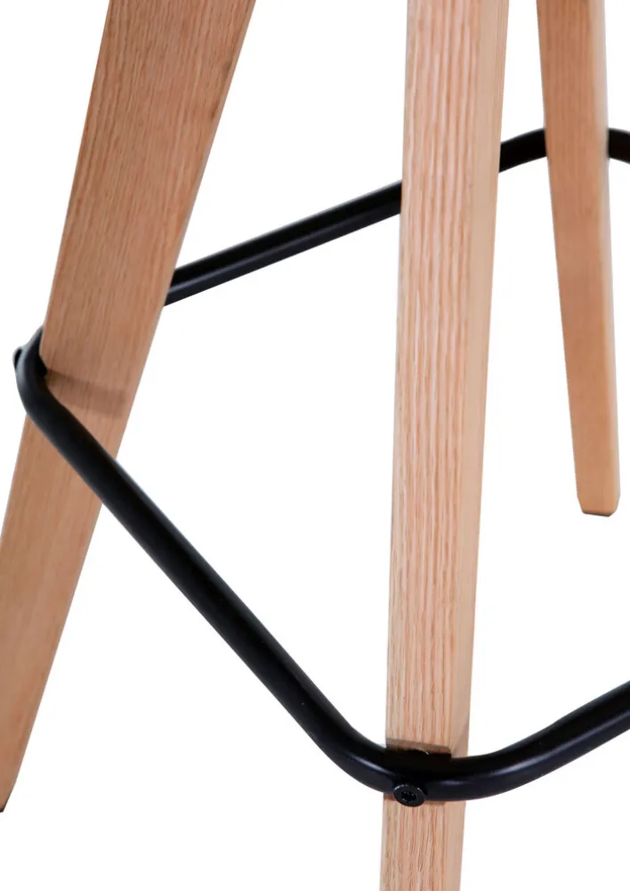 Die Sitzschale des Barhockers CHILL ist mit einem atmungsaktiven Schaumstoff gepolstert und mit einem strapazierfähigen Textil bezogen. Das Vierfußgestell besteht aus Holz und hat lackierte Oberflächen. Die Fußablage des Barhockers ist aus Metall gefertigt.