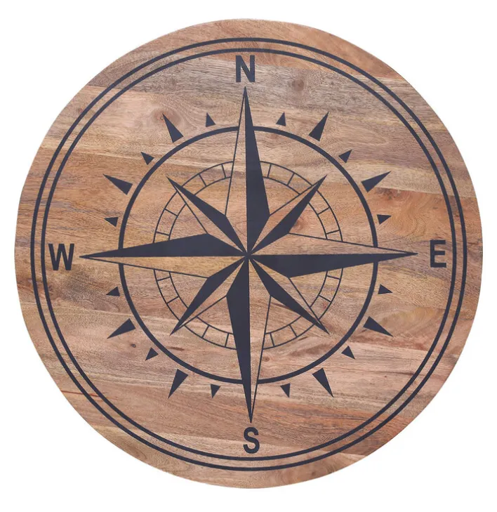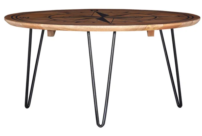 Der INTERhome Couchtisch YANKEE vereint sein schwarz pulverbeschichtetes Dreifußgestell aus Metall mit einer runden Tischplatte aus hochwertigem Mangoholz. Auf der Tischplatte bietet der Sofatisch ausreichend Ablageflächen für Snacks, Getränke und alles, was während eines gemütlichen Abends neben der Couch benötigt wird. Das Highlight des Tisches ist jedoch das außergewöhnliche Design der Tischplatte im Stil eines Kompasses. Durch den extravaganten Look wirkt der Couchtisch zwar rustikal, er lässt sich jedoch vielseitig kombinieren.