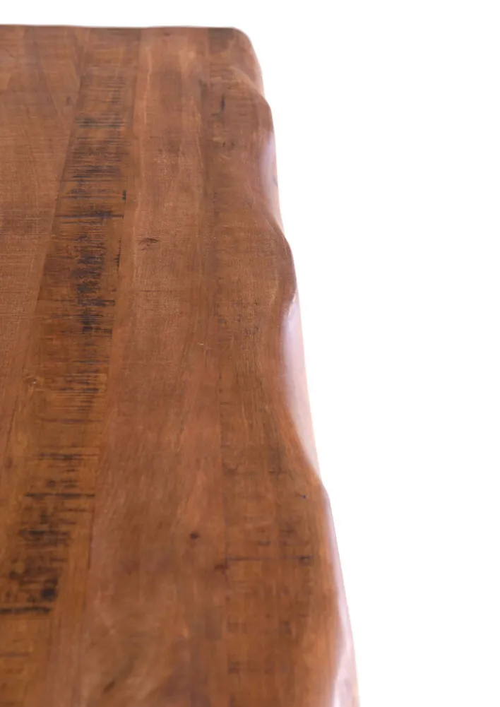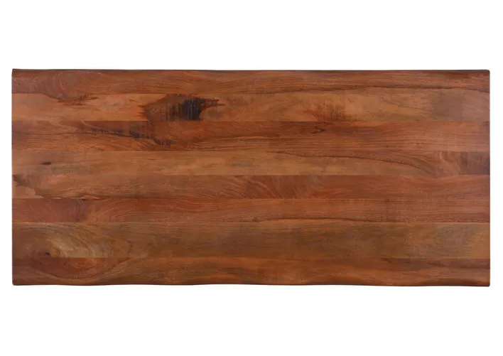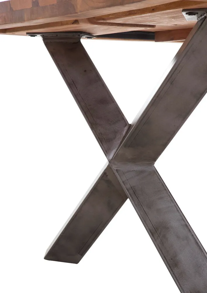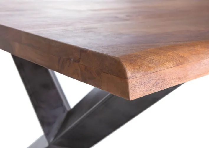 Alle Bestandteile des Esstisches mit dem spannenden X-Gestell sind leicht zu pflegen. Während die Tischplatte aus massivem Holz des Mangobaums gearbeitet ist, bestehen die beiden Teile des Gestells aus robustem Metall in der Farbe Schwarz. Die Oberfläche der langlebigen Holzplatte ist gebeizt und lackiert. Das Modell ist ideal für die Essecke im Wohnzimmer oder für ein Esszimmer geeignet.