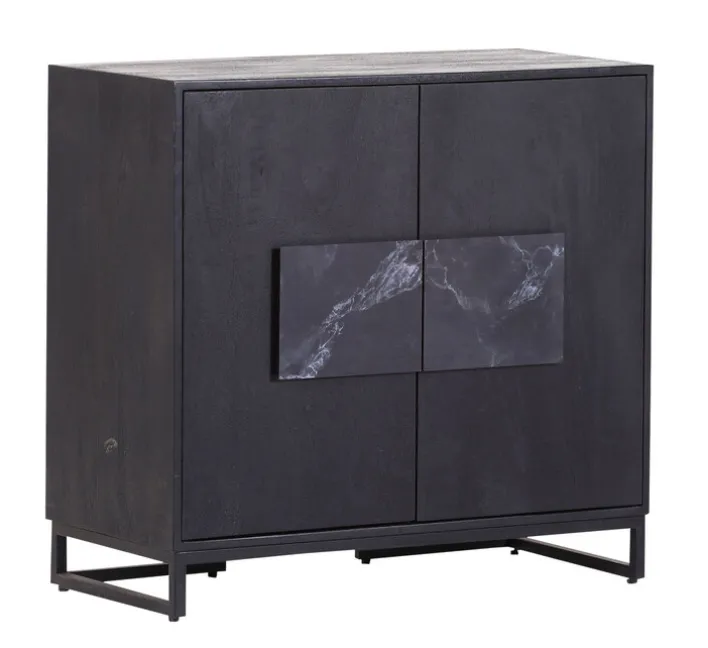 Mit einer Breite von 85 cm, einer Höhe von 80 cm und einer Tiefe von 47 cm bietet die Kommode ausreichend Stauraum. Sie verfügt über zwei Drehtüren und einen Einlegeboden, die eine flexible Nutzung ermöglichen. Die Fronten sind mit einem auffälligen, marmorähnlichen Muster versehen, das dem Möbelstück einen besonderen Akzent verleiht. Die Kombination aus Holz, Metall und Kunststoff sorgt für Stabilität und Langlebigkeit.