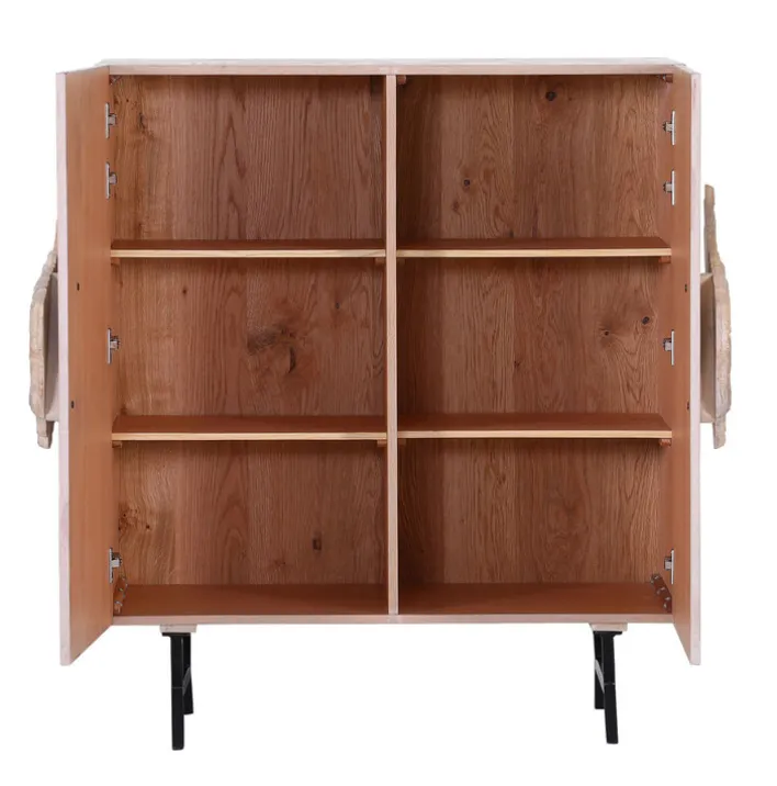 Die INTERhome Kommode HEAVEN & HELL hat natürlich nicht nur optisch einiges zu bieten. Sie ist aus massivem Eichen- und Mangoholz gefertigt und bietet mit einer Größe von 100 x 117 x 51 cm viel Stauraum bei möglichst geringem Platzbedarf. Hinter den Drehtüren, die sich an den Engelsflügen öffnen lassen, lassen sich Alltagsgegenstände in sechs Fächer übersichtlich aufbewahren. Die elegante Optik perfektionieren schwarz pulverbeschichtete Füße aus Metall. Mit ihrem extravaganten Look macht die Kommode in modern und klassisch eingerichteten Wohnräumen gleichermaßen eine gute Figur.