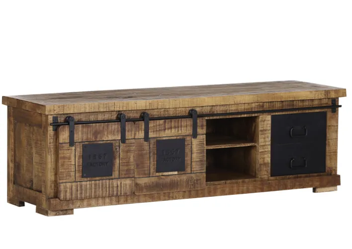 Das Design des Lowboards BARNEY vom Label INTERhome wirkt wuchtig und kantig. Dafür steht die massive Ausführung aus gebeiztem Mangoholz und pulverbeschichtetem Metall. Dieser Industrial Shabby Chic hat gleichzeitig einen authentischen Retro-Charme. Dieser zeigt sich unter anderem im Schriftzug „1867 FACTORY“ auf den beiden Schiebetüren. Sie sind mit Rollen an einer Leitstange befestigt. Auf der rechten Seite befinden sich zwei Schubkästen, links ist ein großes Ablagefach und der mittlere Bereich ist durch einen Konstruktionsboden zweigeteilt. Außerdem ist hinten eine Kabeldurchführung vorhanden.