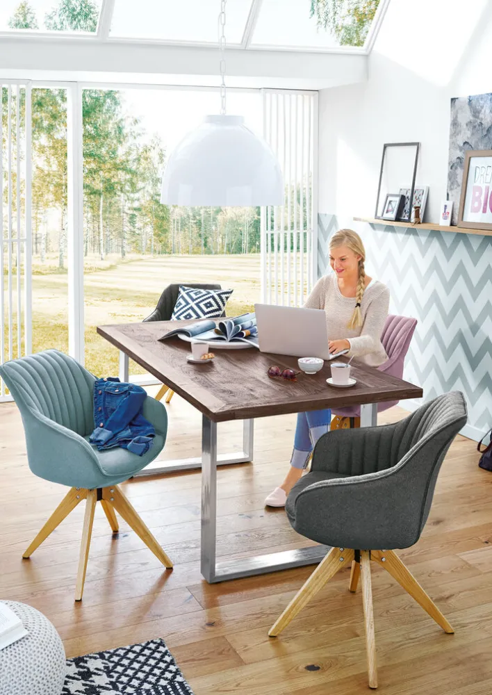 Der Stoffbezug ist in einem edlen Grau gehalten und an der Rückenlehne und den Seiteninnenflächen gerillt. Eine besonders weiche Polsterung sorgt für angenehm entspanntes Sitzen. Die runden, schwungvollen Linien des Designs der Sitzfläche verstärken den gemütlichen Effekt. Das Vierfußgestell ist aus qualitativ hochwertigem Echtholz Eiche massiv lackiert und beherbergt das Drehgestell, das dem Sessel CHILL seinen besonderen Look beschert. Ein flexibler Stuhl, geeignet für viele Wohnbereiche – ob am Küchentisch, Schreibtisch oder als gemütlicher Lesesessel im Wohnzimmer.