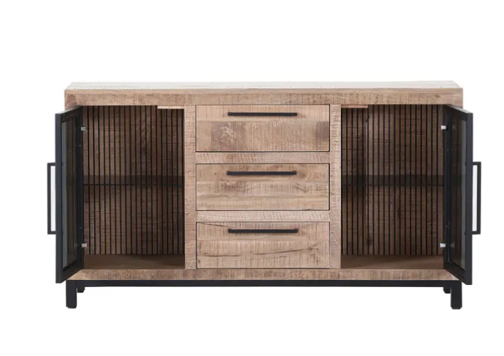 Das aus massivem Mango-Holz (natur sägerau lackiert) angefertigte Sideboard ALTEA ist 145 x 80 cm groß und besticht durch einige außergewöhnliche Details. So verfügt es beispielsweise über eine tolle Rückwand in moderner Lamellen-Optik.