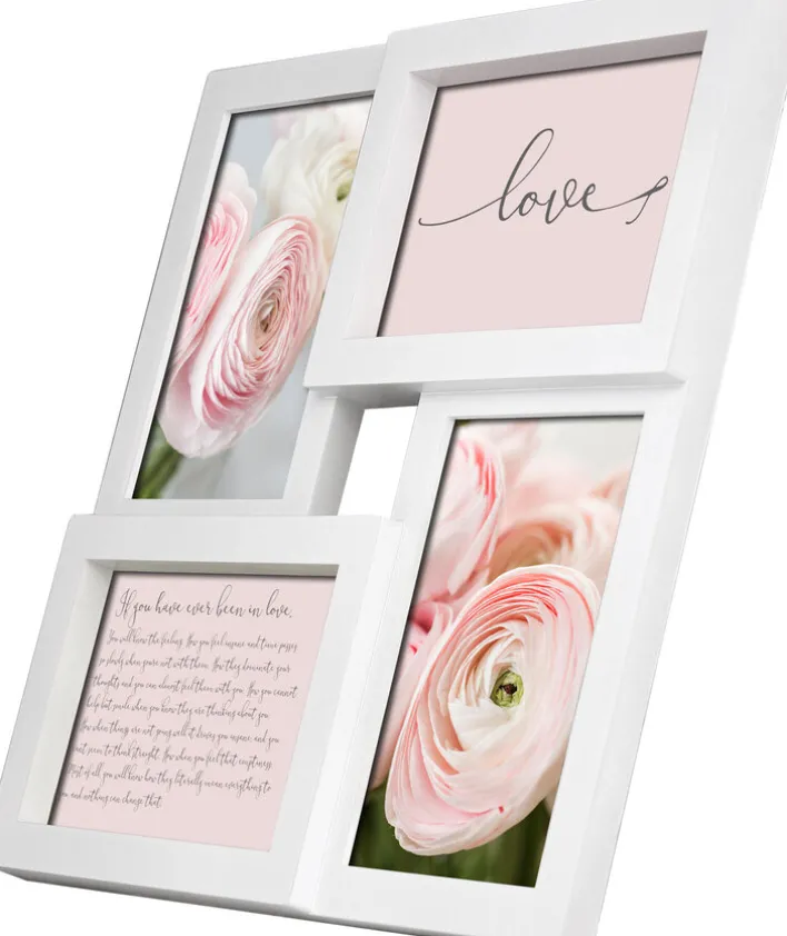 Der INTERTRADING Kollage Bilderrahmen misst 28,3 x 28,3 cm und besteht aus Kunststoff in Weiß. Er ist geeignet für vier Bilder, jeweils im Format 10 x 15 cm.