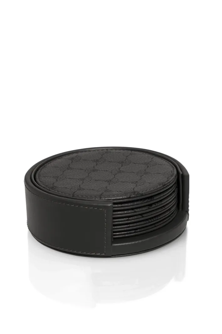 Jeder Untersetzer hat einen Durchmesser von 11,50 cm und eine Höhe von 4,50 cm. Das Gewicht beträgt 0,20 kg pro Untersetzer. Die Farbgebung ist anthrazit-schwarz mit einer grauen Grundfarbe, ergänzt durch eine charakteristische, dezente Musterprägung auf der Oberfläche.