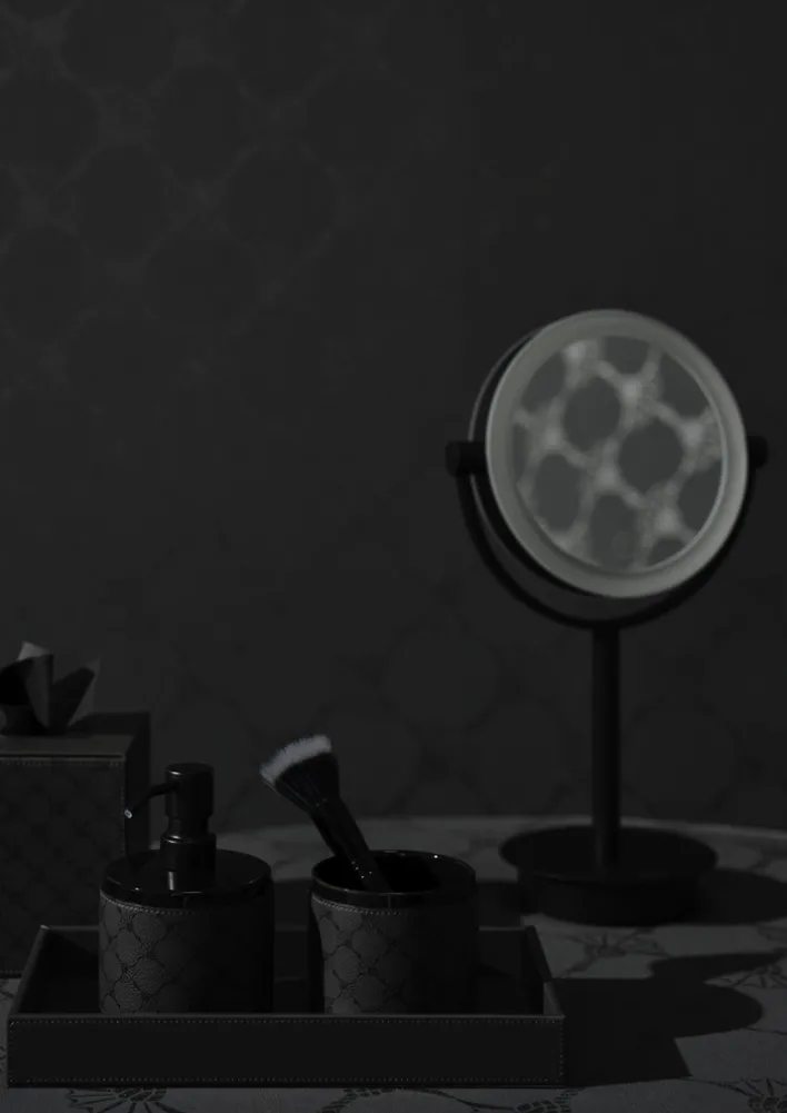 Die Farben anthrazit-schwarzen Farbton verleihen dem Tablett ein modernes und zeitloses Erscheinungsbild. Die Oberfläche besteht aus hochwertigem Kunstleder mit sichtbaren, gleichmäßigen Nähten entlang der Kanten. Im Inneren ist ein dezentes, grafisches Muster erkennbar, das für einen optischen Akzent sorgt.