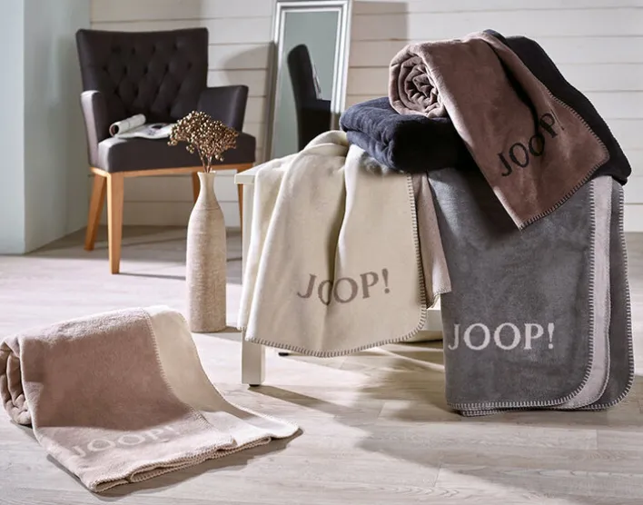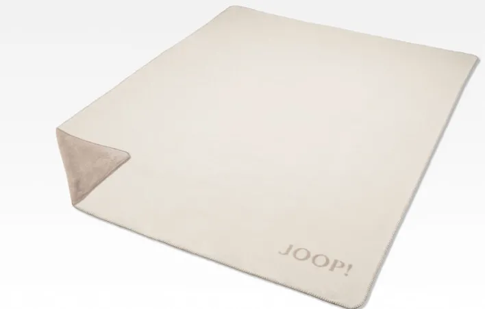 Die Wohndecke der Serie UNI DOUBLEFACE präsentiert sich in einem dezenten Beigeton mit ecrufarbenem Akzent und ist mit einer sichtbaren Kettelnaht eingefasst. Das Design ist einfarbig gehalten, auf einer Seite mit einem klaren JOOP!-Schriftzug, der sich kontrastierend vom Hintergrund abhebt. Die Oberfläche wirkt samtig und weich, was auf die Materialzusammensetzung aus 58 % Baumwolle, 35 % Polyacryl und 7 % Polyester zurückzuführen ist. Durch das Mischgewebe entsteht eine angenehme Haptik und ein gleichmäßiges Erscheinungsbild.