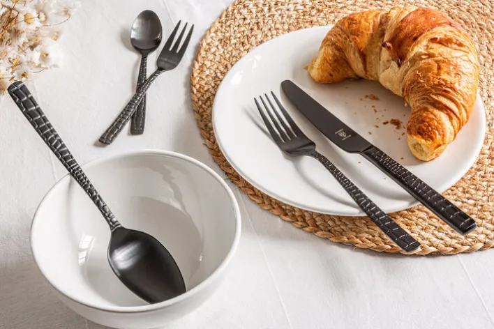 Die gleichmäßig schwarze Farbgebung des Metalls sorgt für ein einheitliches, elegantes Gesamtbild. Die Formgebung der Besteckteile orientiert sich an zeitlosen Linien, während die griffige Struktur der Griffe sowohl zur Ästhetik als auch zur Haptik beiträgt. Geeignet ist das Set für den Einsatz im Innenbereich.