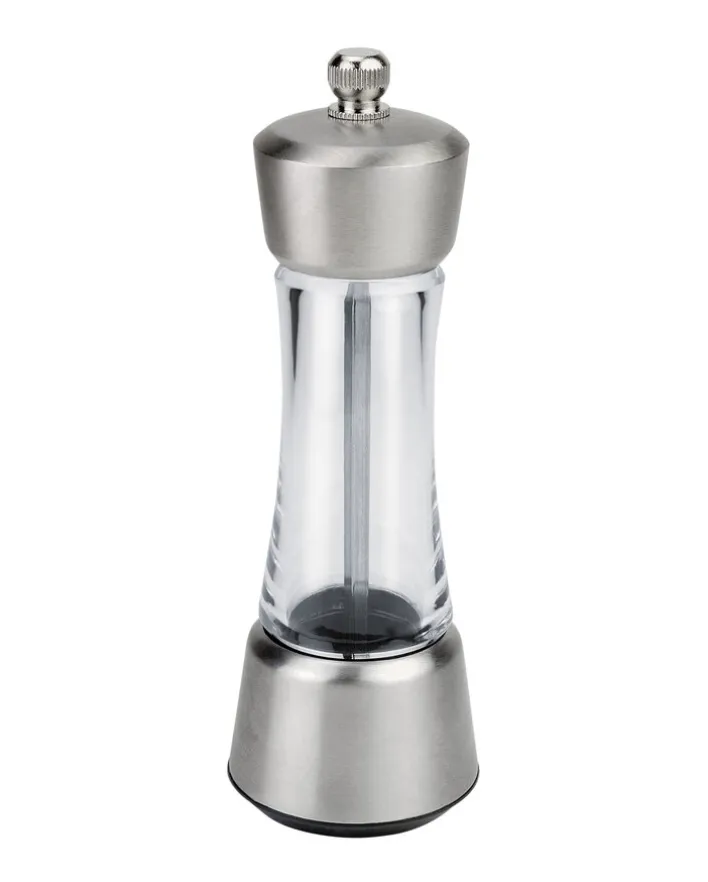 Der Behälter trockenes Salz oder Pfeffer besteht aus transparentem Glas. Dadurch ist die Füllhöhe jederzeit einsehbar. Der Deckel und die Fassung für das Mahlwerk sind aus gebürstetem Edelstahl. Das verwendete Metall ist rostfrei und pflegeleicht. Das hochwertige Mahlwerk der Pfeffer-/ Salzmühle ist aus Keramik und dadurch besonders robust.