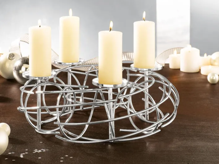 Der JUSTINUS Adventskranz LIFE STYLE besteht aus einem eleganten, silberfarbigen Metallgeflecht und vier Kerzenhaltern. Er ist für die Verwendung mit großen Stumpenkerzen gedacht und sorgt während der Adventszeit für romantischen Kerzenschein. Wer mit einem minimalistischen Adventskranz nur wenig anfangen kann, kann ihn mit geringem Aufwand in eine prachtvolle Weihnachtsdekoration verwandeln. Mit Tannengrün, sonstigen immergrünen Zweigen, Schleifen und etwas getrockneten Gewürzen wie Sternanis oder Zimtstangen sieht der chromfarbige Adventskranz sofort natürlicher aus.