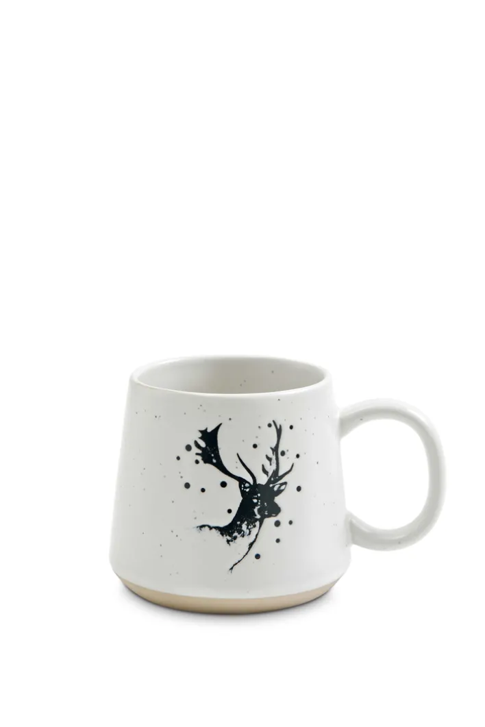 Der Kaffeebecher besteht aus Steingut-Keramik und zeigt eine zylindrische, nach unten leicht ausgestellte Form mit einem stabilen Henkel. Die Hauptfarbe ist Weiß mit einer matten, leicht gesprenkelten Oberfläche. Auf der Vorderseite befindet sich ein schwarzes Hirschmotiv, das als grafischer Druck umgesetzt ist. Die Tasse hat eine Höhe von 9 cm, eine Breite und Tiefe von jeweils 8,3 cm sowie ein Fassungsvermögen von 430 ml. Der Becher eignet sich für den Einsatz im Innenbereich, insbesondere im Wohnzimmer.