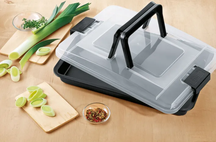 Diese praktische KAISER Backform aus schwarzem, antihaftbeschichtetem Stahl überzeugt mit einer Größe von 42 x 29 x 4 cm, vielfältigen Nutzungsmöglichkeiten und praktischen Detaillösungen wie einer hochwertigen Transporthaube mit klappbarem Griff.